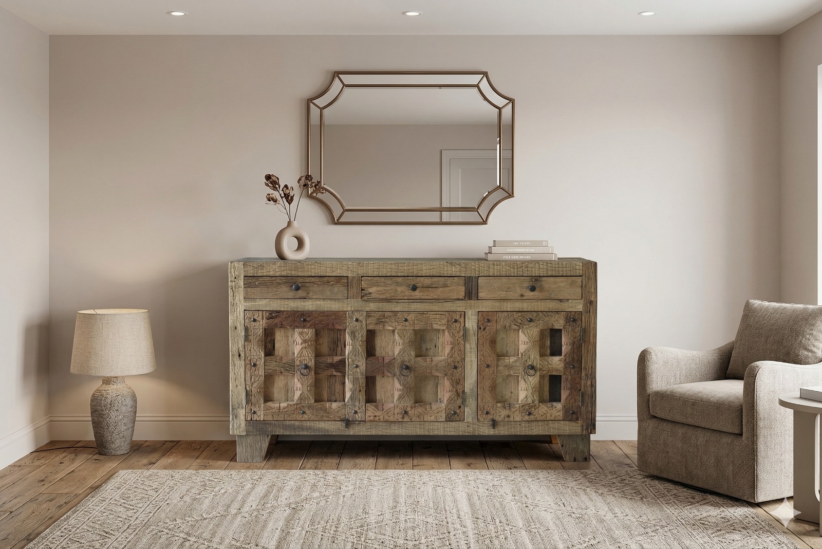 Crafted from reclaimed sleeper wood, this sideboard is a striking blend of rustic charm and modern utility. The natural weathered texture, knots, and rich patina of sleeper wood give it a unique character, ensuring that no two pieces are ever the same. Designed with spacious cabinets and sturdy shelves, it provides practical storage for tableware, linens, or everyday essentials, while the broad top surface is perfect for showcasing décor or serving. With its raw, earthy appeal and robust construction, this sideboard not only adds functionality but also becomes a bold statement piece in your home