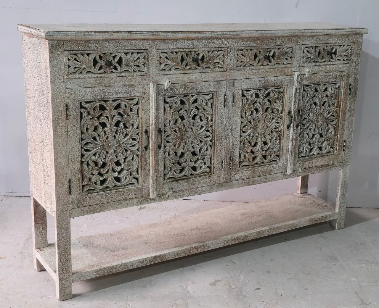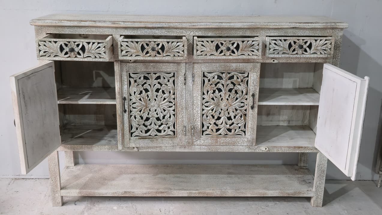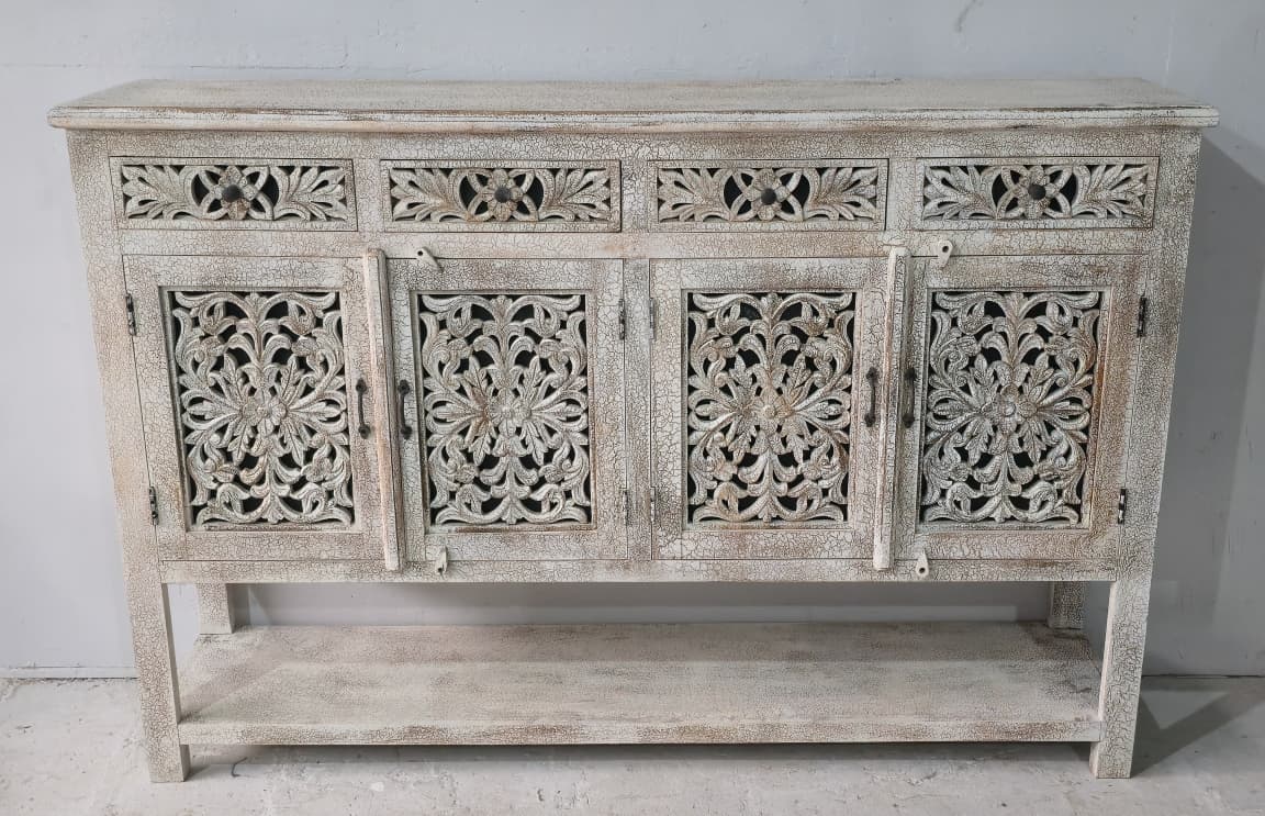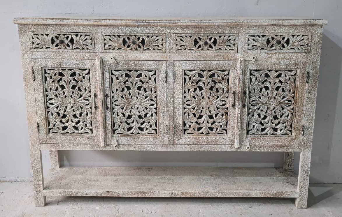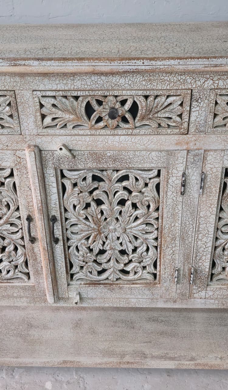 This wooden carved sideboard with brass legs is a stunning fusion of traditional artistry and modern elegance. Handcrafted from solid wood, its surface features intricate carvings that reflect timeless craftsmanship and attention to detail. Resting gracefully on sleek brass legs, the sideboard balances rustic charm with contemporary sophistication. Designed with spacious cabinets and drawers, it offers ample storage while serving as a statement piece in your dining or living area. The warm wood tones paired with the golden sheen of brass make this sideboard a perfect blend of function, durability, and refined style.