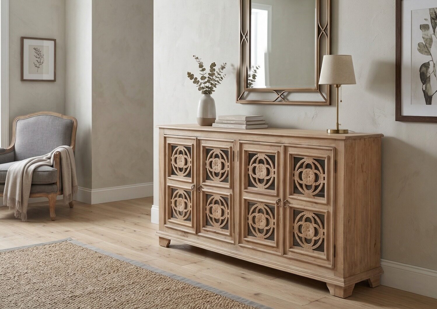 - This wooden sideboard is a perfect blend of style and practicality, designed to elevate your living or dining space. Crafted from solid wood, it highlights the natural grain and warmth of the material while ensuring strength and durability. Featuring spacious cabinets and smooth drawers, it offers ample storage for dinnerware, linens, or everyday essentials. The flat top surface provides the ideal spot to display décor, art pieces, or serveware. With its timeless design and versatile charm, this sideboard effortlessly complements both modern and traditional interiors, making it a functional statement piece for your home.