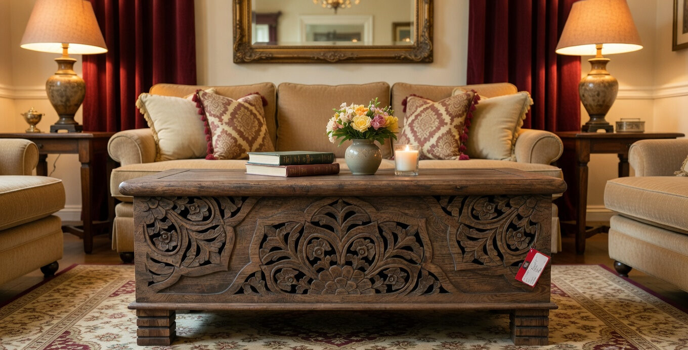 Elevate your living space with the weighted elegance of this masterfully carved storage trunk. This piece is a celebration of traditional woodcraft, featuring an expansive front panel adorned with deep-relief floral and botanical motifs. The intricate “jaali” inspired cut-outs create a mesmerizing play of light and shadow, bringing a sense of depth and artisanal soul to the dark, rich walnut finish.