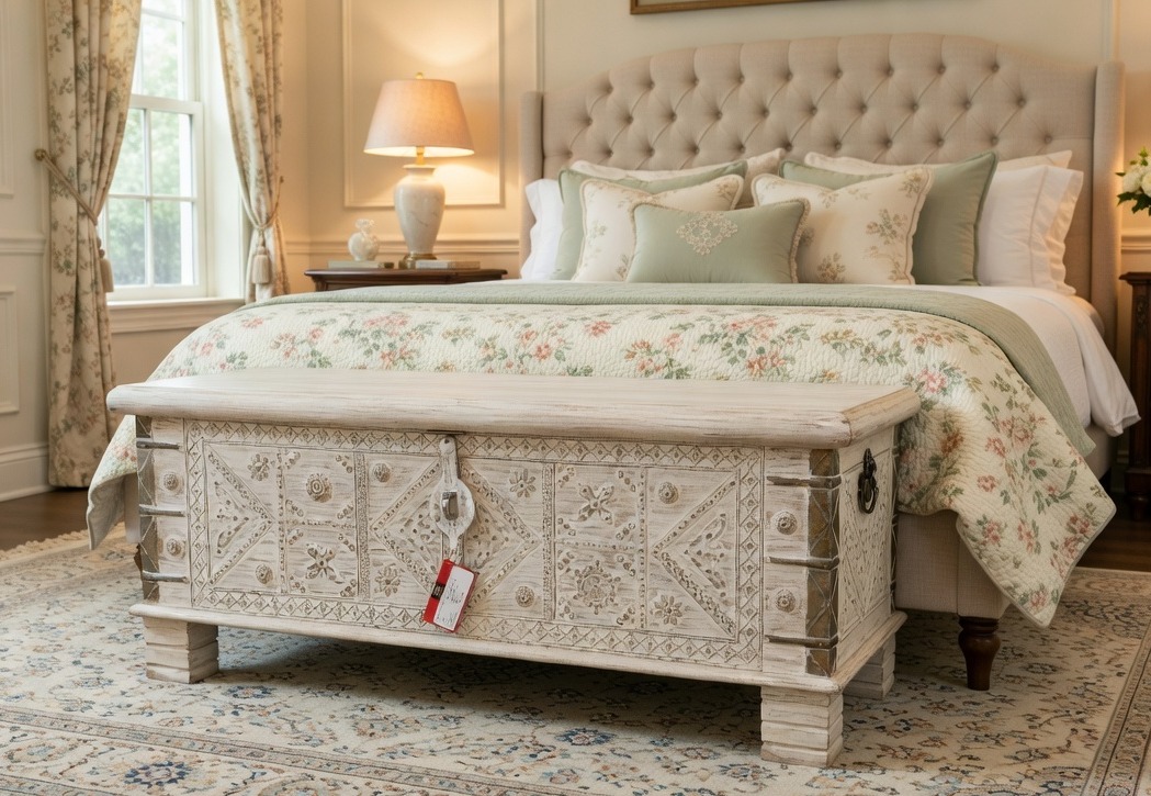 Breathe new life into your living space with this exquisitely hand-carved storage trunk, a piece that seamlessly blends historical artistry with modern functionality. The chest is finished in a serene, distressed white wash, meticulously applied to highlight the intricate geometric and floral carvings that dance across its facade. Every panel tells a story of craftsmanship, featuring a rhythmic interplay of diamond motifs and botanical details that create a rich, tactile surface.