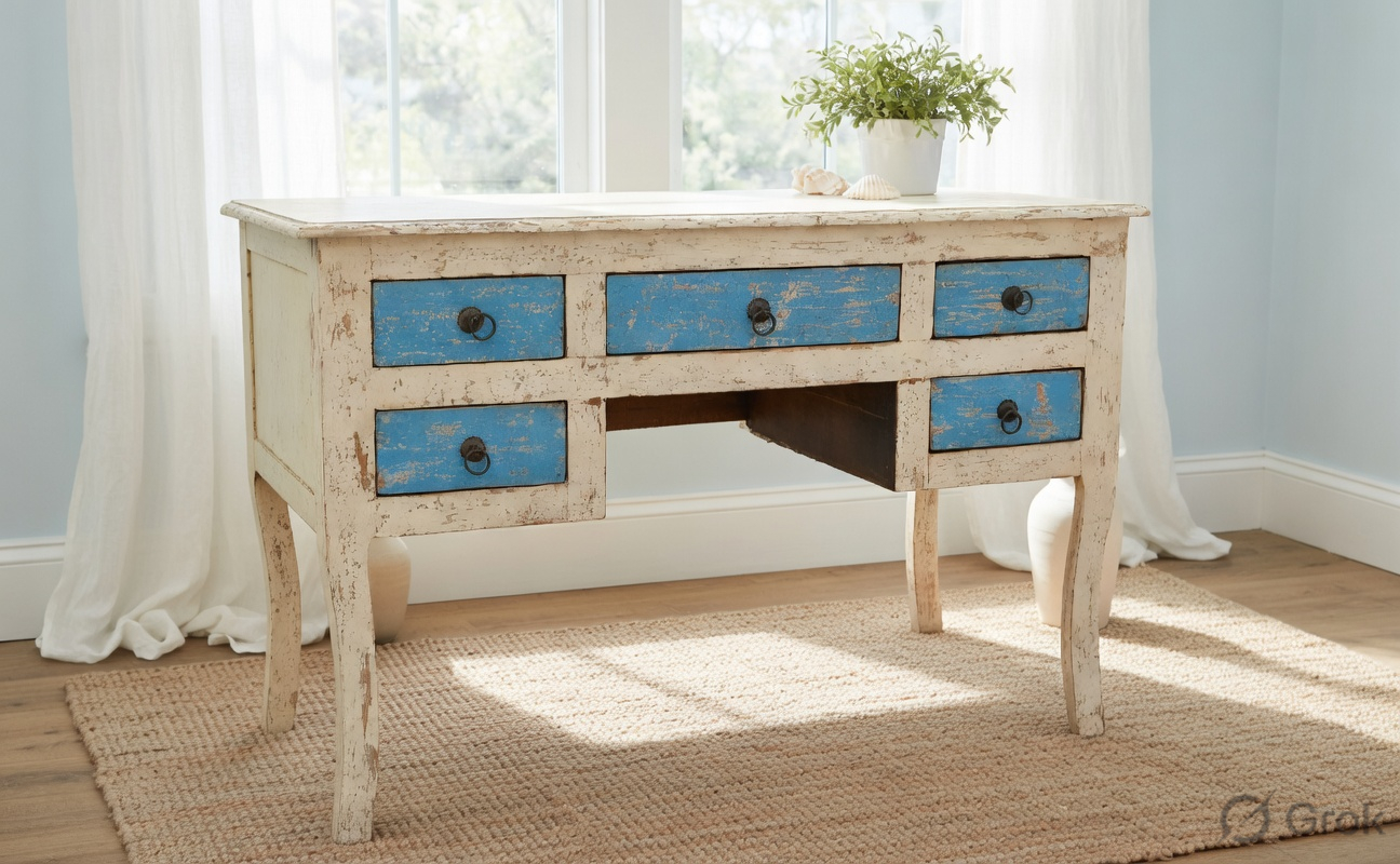 #WoodenDeskTable #RusticFinish #WhiteAndBlueFurniture #HandcraftedDesign #SolidWoodFurniture #CoastalStyle #VintageCharm #FunctionalEleganc - Furniture Type : Desk Table