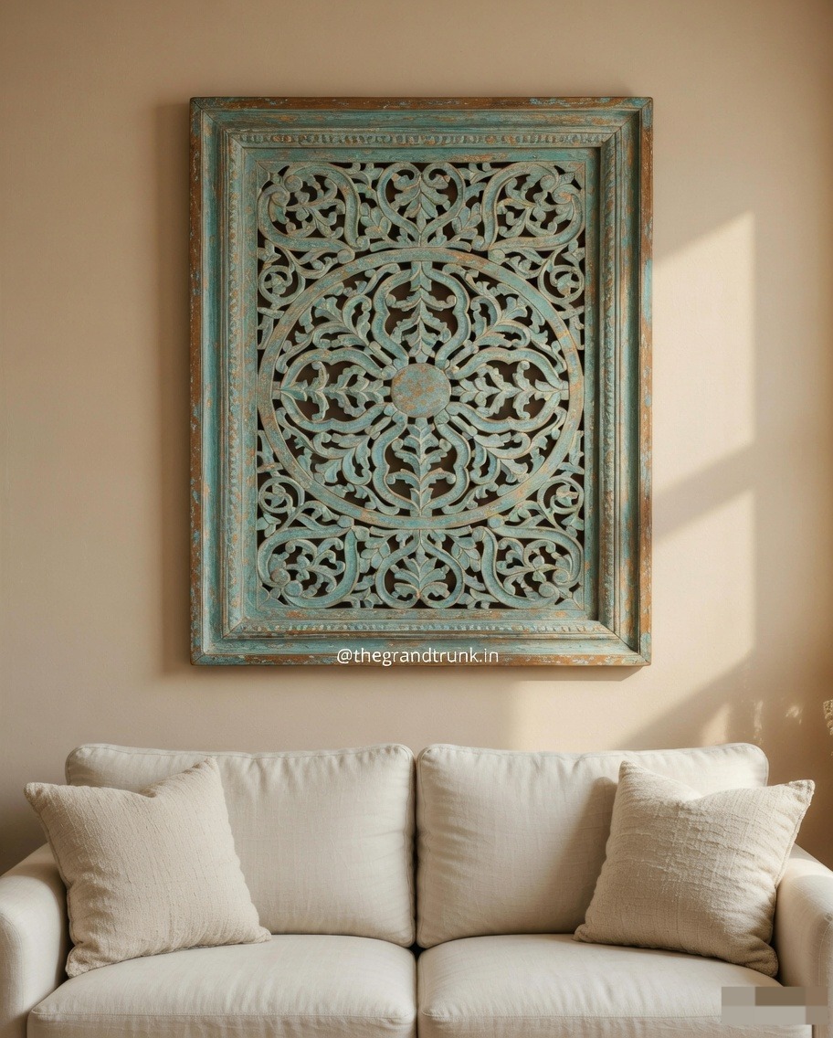 Our CARVED WALL PANEL is a Beautiful Hand Carved Decorative Display Panel/Decorative Head Board Made From Indian Wood And distressed and painted in several color. This wall decoration panel can be used in the living, bedroom, and hallway.
