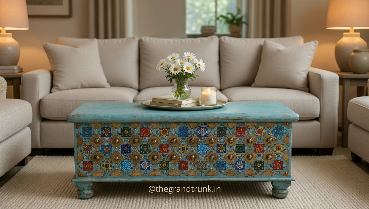 Framed by an intricate lattice of embossed brass-finished metalwork, each jewel-toned tile adds a vibrant pop of personality against the serene blue frame. Beyond its artistic allure, this substantial trunk offers high-capacity utility; its flat-top surface is perfectly proportioned to function as a distinctive coffee table, while the deep interior provides a discreet sanctuary for stowing textiles and modern essentials. Set upon sturdy, hand-turned bun feet, it balances ethnic inspiration with a refined elegance that anchors any living space with a sense of history.