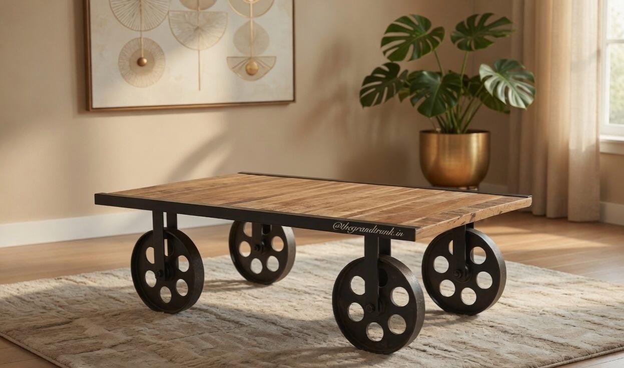 A styled home interior makeover with this CART COFFEE TABLE isn’t a bad idea. After all, it’s a remarkable industrial furniture that can be a contrasting element without overshadowing other furniture in your living space. This coffee table with casted wheels is made up of rarely available old sleeper wood and heavy-duty metal parts. It has the natural rustic charm making it an ideal piece of furniture for your lounge area, farmhouse or dining space. You can use this multipurpose coffee table for breakfast, brunch, and evening snacks. It is pre-assembled and you can buy this vintage furniture online as well.
