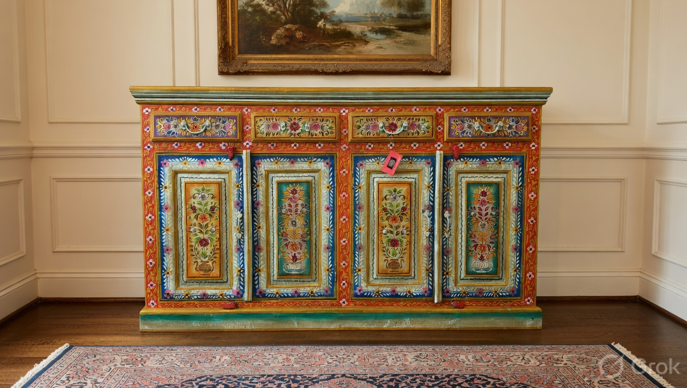 Add a touch of elegance and charm to your interiors with this wooden painted sideboard. Crafted from solid wood and finished with a smooth painted surface, it blends durability with refined style. The hand-painted finish enhances its character, while the spacious cabinets and drawers offer practical storage for tableware, linens, or essentials. Its flat top surface is perfect for displaying décor, art pieces, or serving during gatherings. Whether styled in a dining room, living space, or hallway, this sideboard brings both functionality and a pop of personality to your home.
