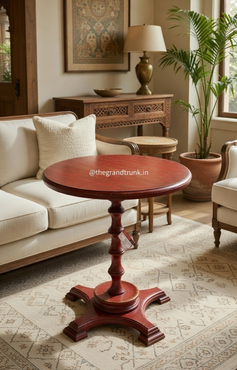 A masterful expression of classical silhouette and vibrant texture, this handcrafted pedestal table serves as a sophisticated focal point for the curated home. The piece is defined by its elegant circular top and a signature hand-turned central pillar, featuring rhythmic architectural bulbous accents. The specialized crimson-toned finish is meticulously distressed, revealing glimpses of the underlying material to create a curated, antique-inspired aesthetic that anchors the room with heritage soul.