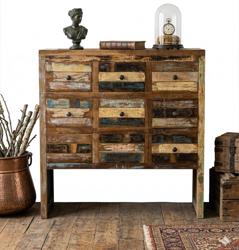 • Eclectic Multi-Color Design: The drawer fronts form a rich mosaic of multi-colored, distressed plank wood, showcasing a genuine aged patina.