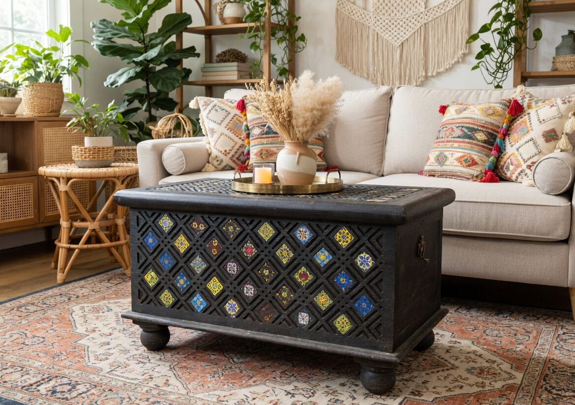 A captivating fusion of global artistry and architectural form, this storage trunk serves as a soulful centerpiece for the curated home. Meticulously handcrafted, the piece features a deeply distressed ebony finish that reveals hints of the natural wood grain, offering a sophisticated, weathered aesthetic. The facade is a masterclass in detail, featuring a hand-carved latticework frame that houses a vibrant mosaic of hand-painted ceramic tiles.