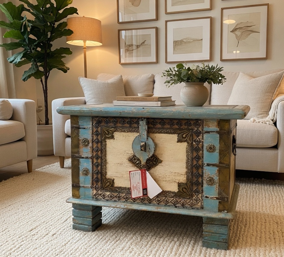 Beyond its striking visual presence, this chest is a study in functional craftsmanship. Authentic iron-bound strapping and a substantial central hasp reinforce its vintage traveler’s silhouette, while the solid wood construction ensures a lasting legacy. Whether utilized as a conversational side table or a sophisticated sanctuary for cherished textiles, this trunk grounds a room with a sense of history and artisan soul, making it a definitive statement piece for the curated home.