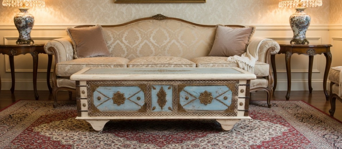 Designed to be a conversation-starting focal point, this versatile chest elevates the aesthetic of any curated home. The hand-applied weathered finish allows the natural character of the wood to emerge, ensuring an authentic vintage appeal. Whether utilized as a sophisticated storage solution for cherished textiles or as a distinctive accent bench in a grand foyer, its blend of bright hues and regal metal detailing brings a warm, worldly soul to your living space.