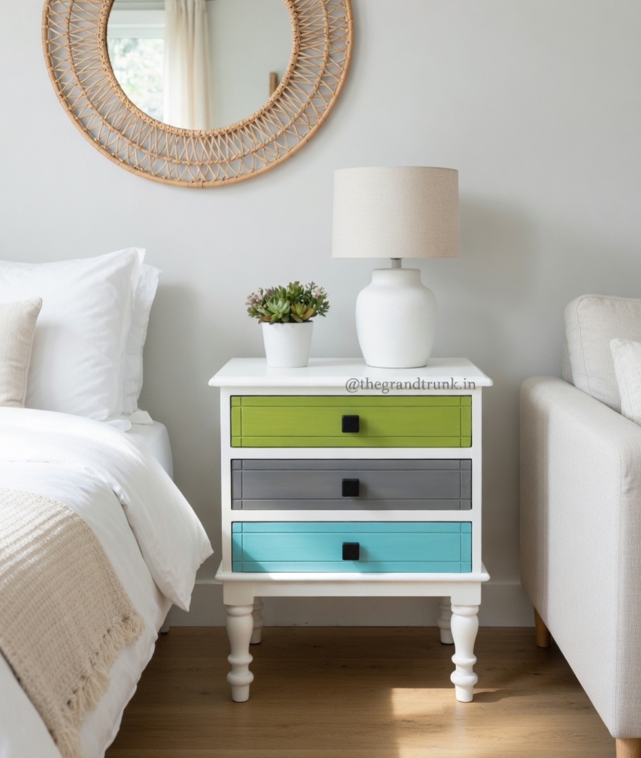#WoodenBedsideTable #MultiColoredFurniture #WhiteDrawerTable #BohemianStyle #HandcraftedDesign #SolidWoodFurniture #VibrantInteriors #FunctionalElegance - Furniture Type : Side Table