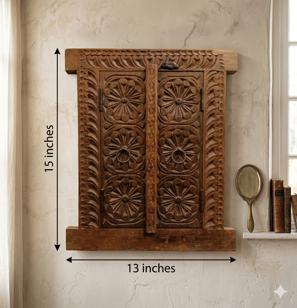A beautiful celebration of traditional woodcraft, this hand-carved teak window captures the warmth and intricate artistry of vintage Indian architecture. The centerpiece features a stunning series of six radial sun-burst medallions, each deeply carved to create a rhythmic play of light and shadow.