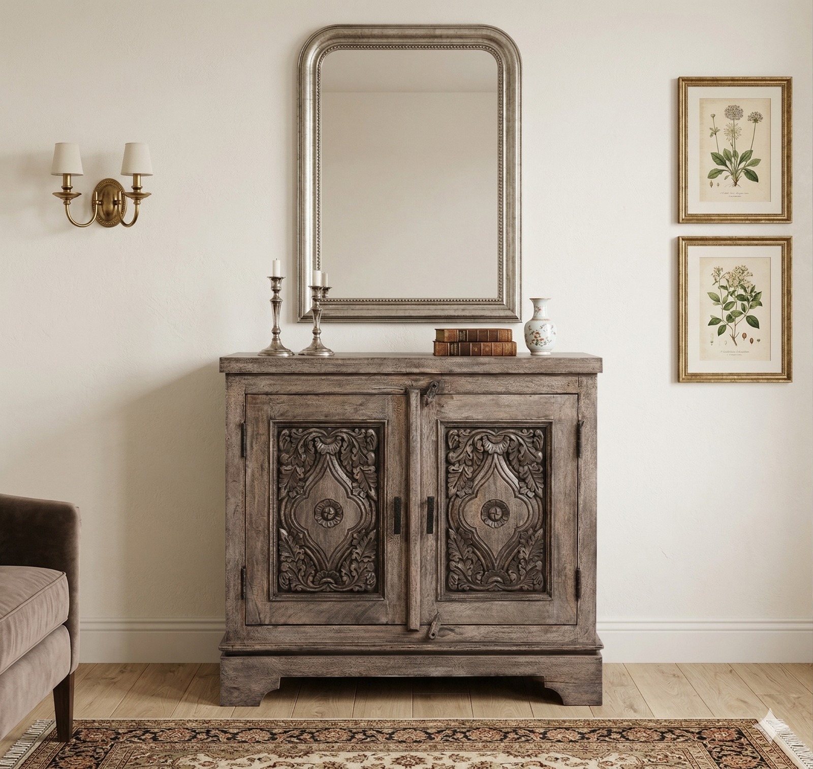 Be the first to review “Woodn Carved Cabinet Gray Distress (F1115)”